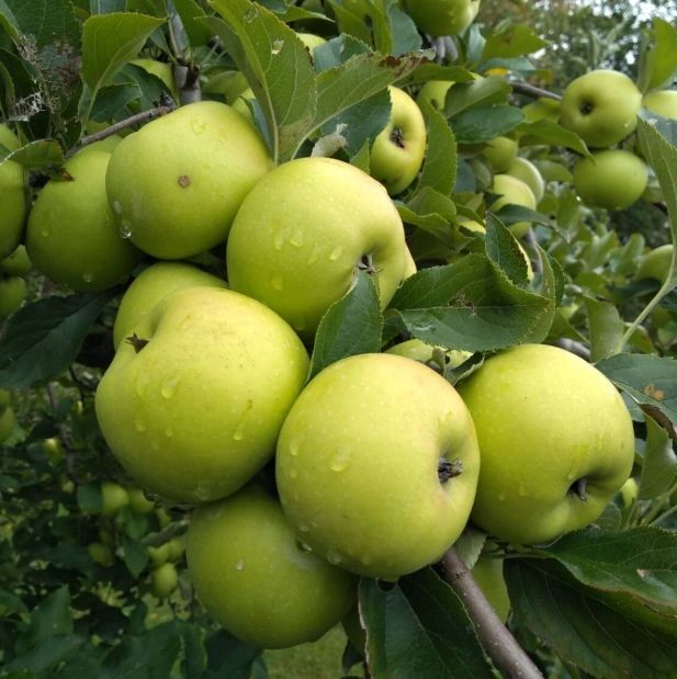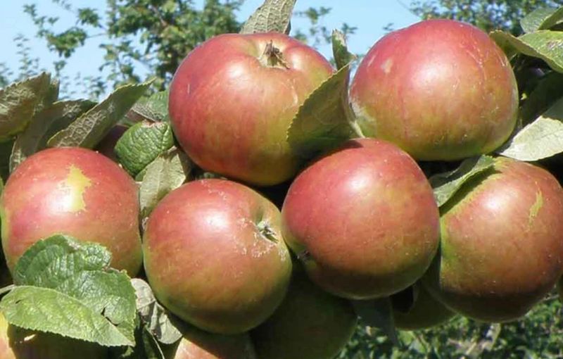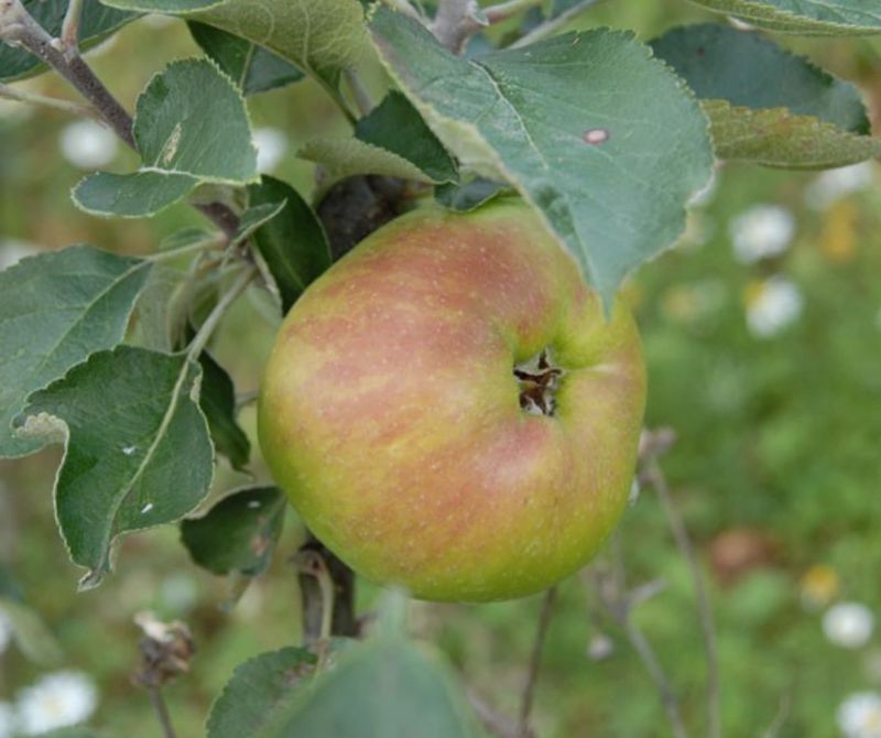 This sweet and rich apple has a high sugar content and produces a syrupy cider. The greenish-yellow fruit gathers red stripes and ripens towards the end of September.